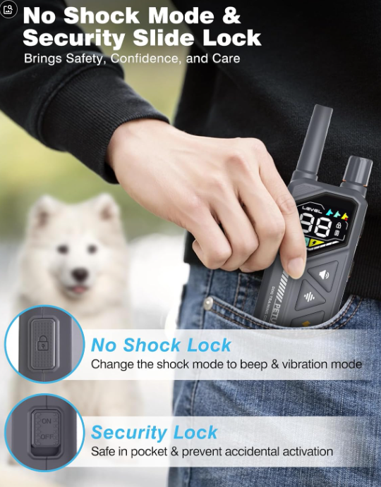 【 𝐍𝐨 𝐒𝐭𝐚𝐭𝐢𝐜 𝐋𝐨𝐜𝐤 & 𝐒𝐞𝐜𝐮𝐫𝐢𝐭𝐲 𝐋𝐨𝐜𝐤 】Our Dog E Collar has a No Static Mode.When this mode is triggered, the static mode of ecollar will switch to the 16th level of sound and vibration, which is suitable for training little or more sensitive doggies. And the instant response Security On/Off Lock also ensures safe usage without fear of accidental touch!