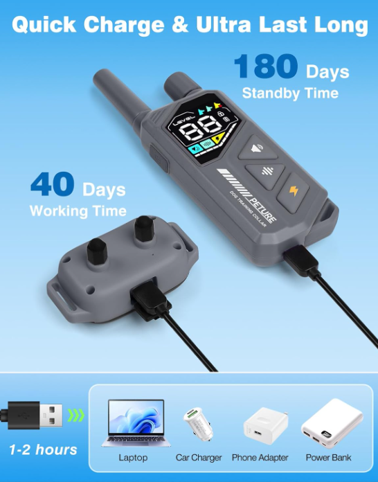 【 𝐄𝐱𝐭𝐫𝐚-𝐋𝐨𝐧𝐠 𝐁𝐚𝐭𝐭𝐞𝐫𝐲 𝐋𝐢𝐟𝐞】The Training Collar with Remote offers a Long-Lasting Battery Life and a convenient 2-in-1 Quick Charging Cable. It only takes 2 Hours to fully charge, providing up to 40 Days of standby time for the receiver and 180 Days for the remote, making outdoor walks and playtime even more enjoyable!